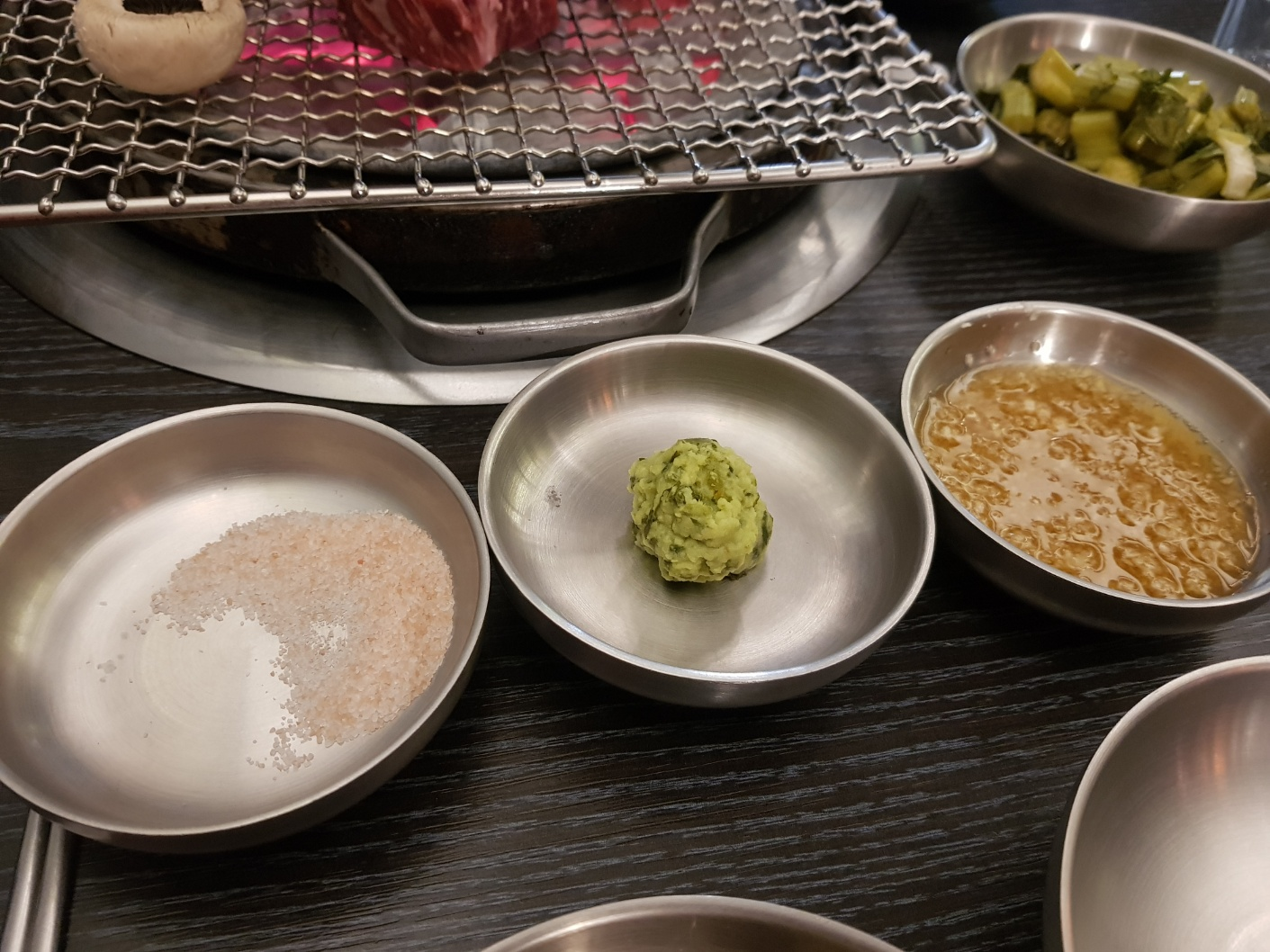 핑크솔트, 마늘기름장 그리고 횃불만의 특이 소스인 명이와사비소스가 있어요!
