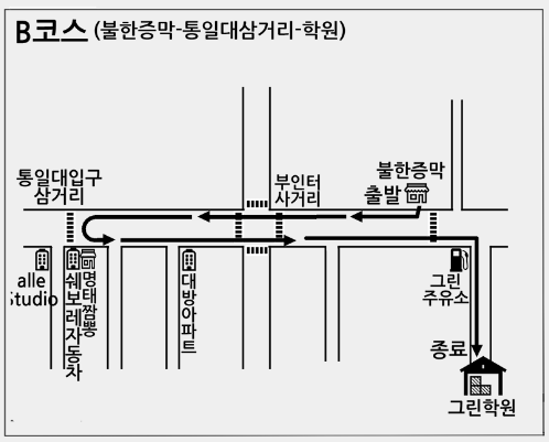B코스는 직진해서 유턴할 곳에서 잘 유턴하고 다시 쭉 직진 후 학원으로 들어가는 코스라